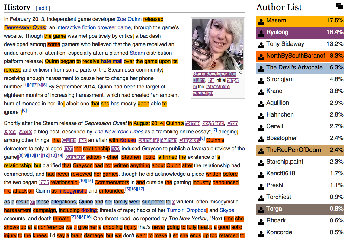 Beim Öffnen eines Wikipedia-Artikels wird eine farbliche Markierung des Textes erstellt, die die ursprünglichen Autor:Innen des Inhalts, eine Autor:Innenliste, geordnet nach dem prozentualen Anteil an der Erstellung des Artikels, und zusätzliche Herkunftsinformationen anzeigt.